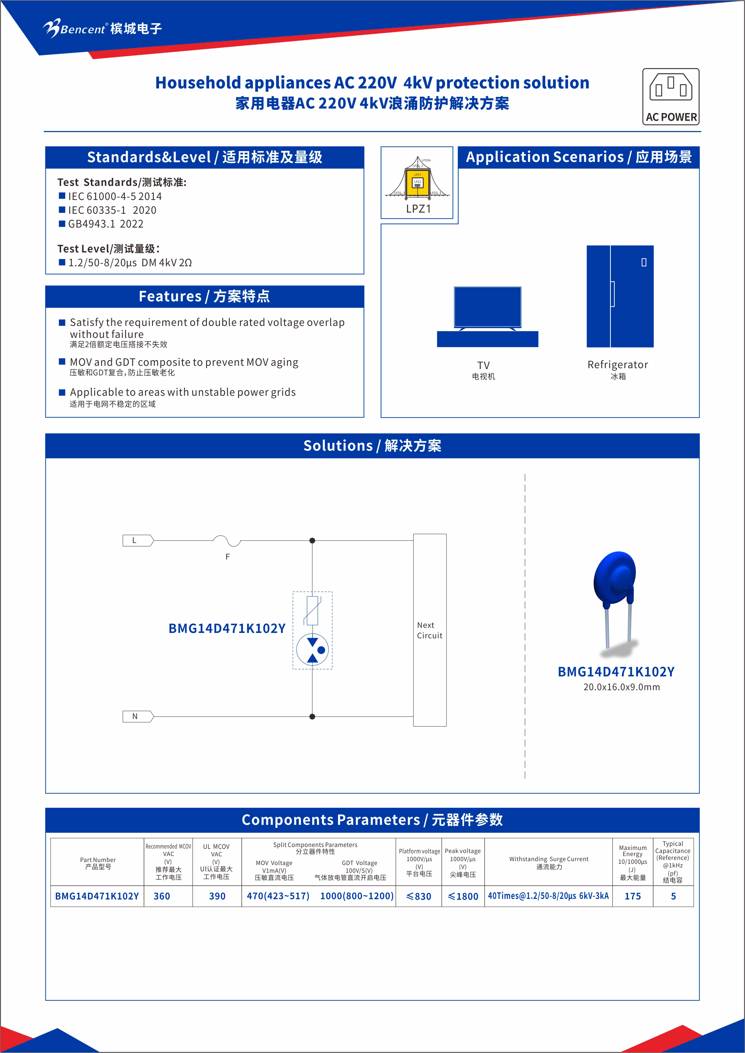 ▚ MOV复合GDT产品BMG系列——能够有效调和新安规与浪涌保护之间的冲突,提供在同等Uc下,低箝位电压的解决方案。